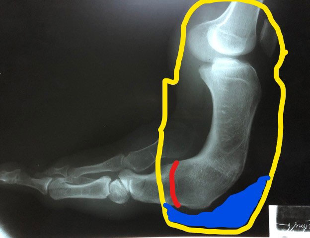 The surgeons, in consultation with the prosthetist, decided that it would be best to amputate Levin’s dysfunctional foot at the point indicated by the red line in this picture of the X-Ray. ROMP-Guatemala would then fabricate the prosthetic socket represented by the yellow lines.